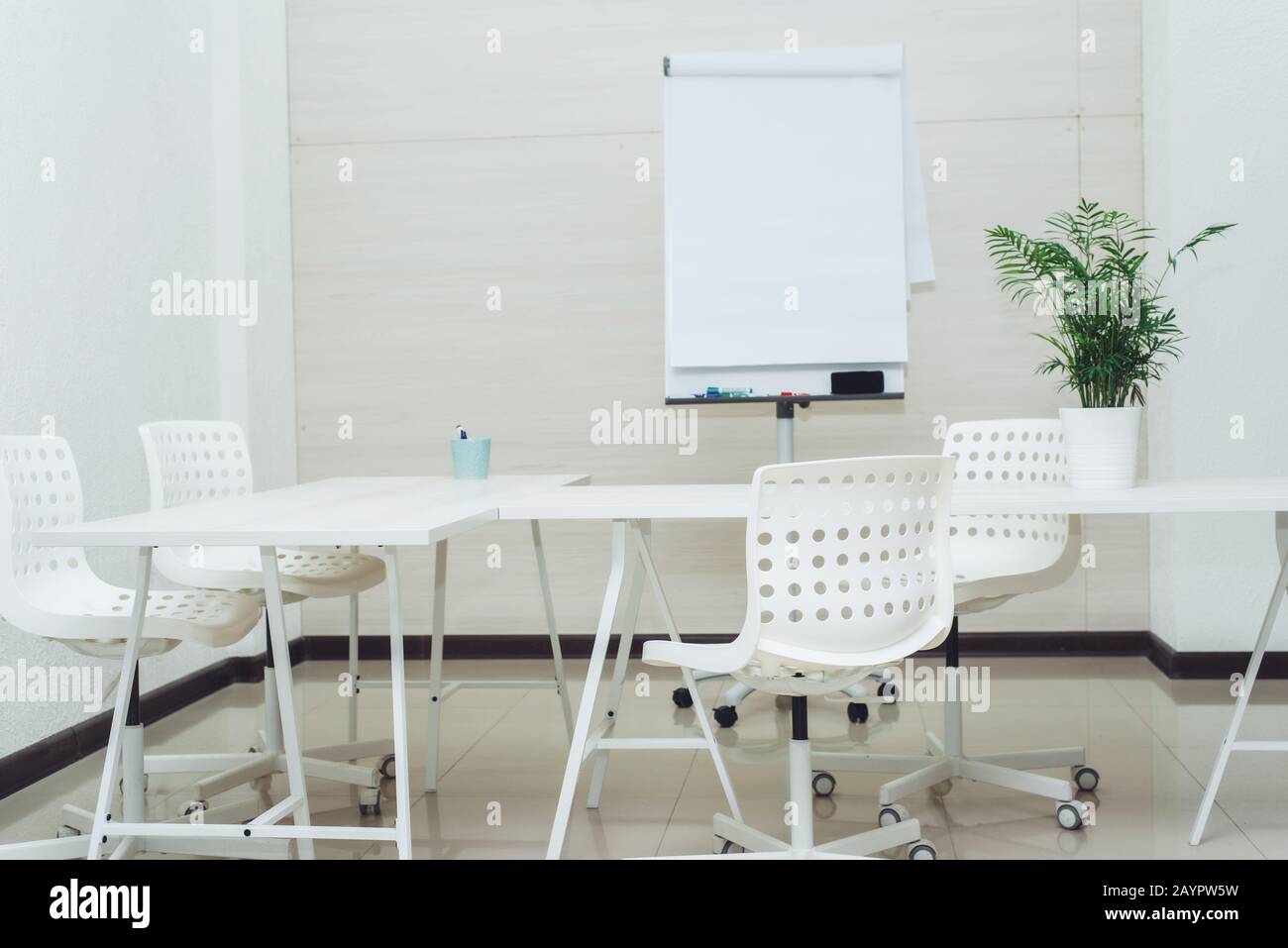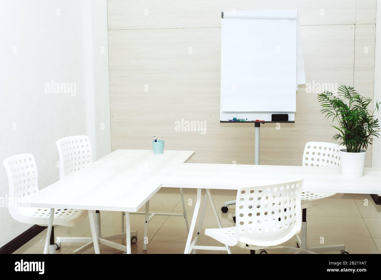 Small Bright Empty Office With Chairs A Table And A Flipchart A