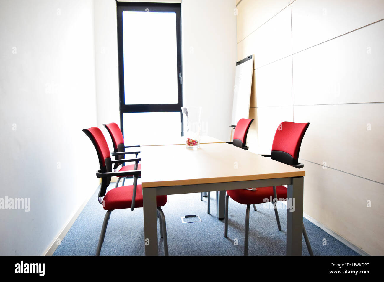 Small Light Empty Office Room With Table And Red Chairs Stock
