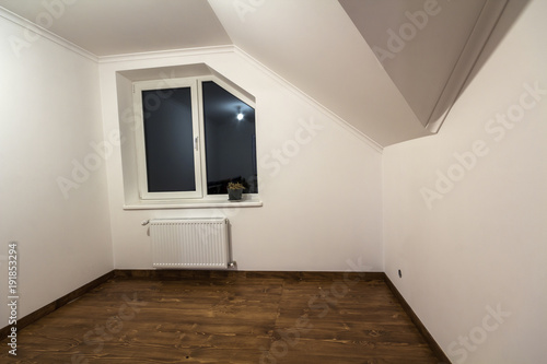 Empty Small Room With Wooden Oak Parquet Floor Newly Painted White Walls Heating Radiator And A Window Attic Room Buy This Stock Photo And Explore Similar Images