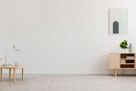 Desk Lamp On A Small Table And A Simple Wooden Cabinet In An Empty Living Room Interior With White Wall And Place For A Sofa Real Photo Royalty Free Images