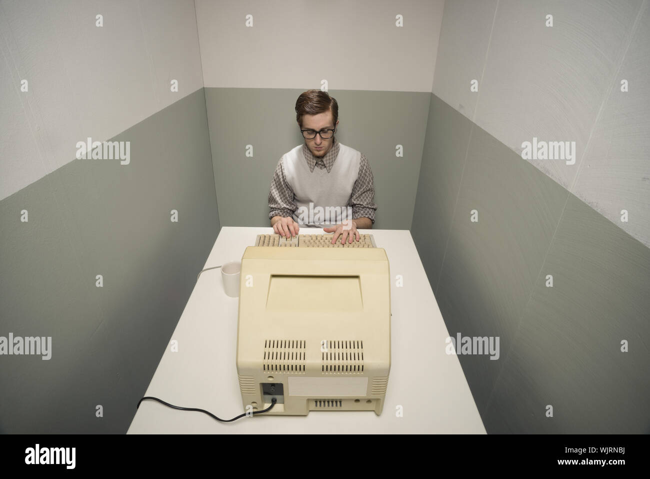 Vintage Nerd Guy Working On Old Computer In A Small Room Stock