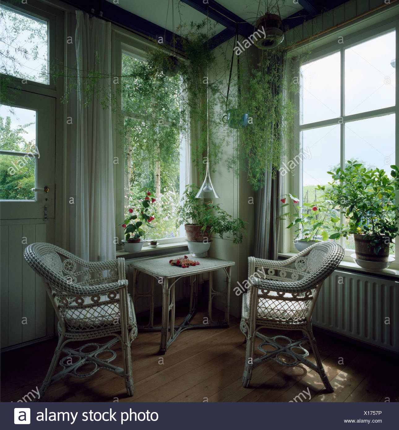 White Wicker Chairs And Trailing Houseplants In Small Cottage